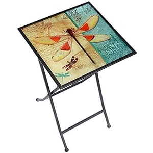 CEDAR HOME Side Table Outdoor Garden Patio Metal Accent Desk with Square Hand Painted Glass, Dragonfly