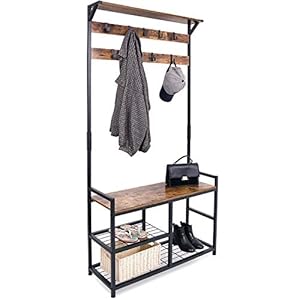 HOMEKOKO Coat Rack Shoe Bench, Hall Tree Entryway Storage Bench, Wood Look Accent Furniture with Metal Frame, 3-in-1…