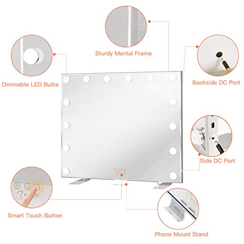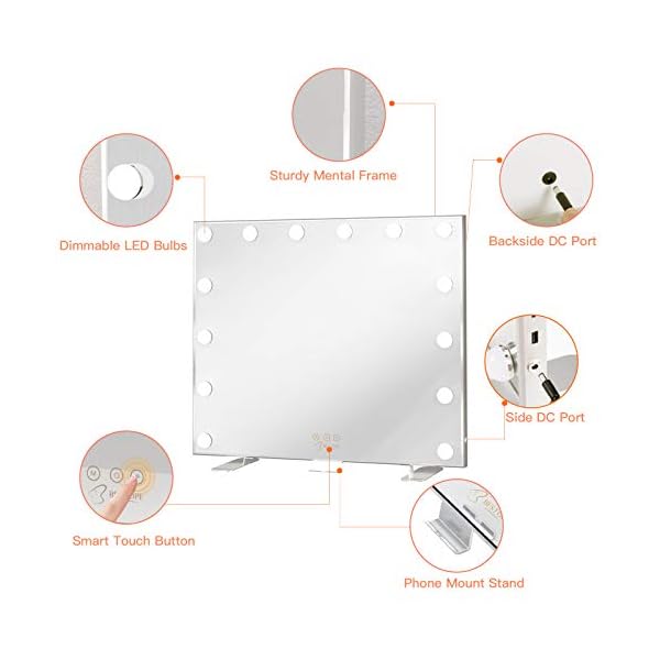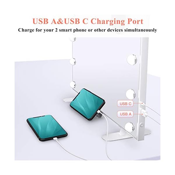 Charge for 2 Phones: The hollywood mirror design with 2 charge ports on the side,USB C and USB A plug can charge for your 2 phones simultaneously while making up.saving your time in busy morning. the phone mount stand can lean your cellphone on.