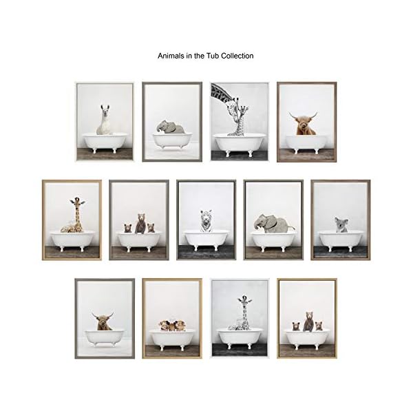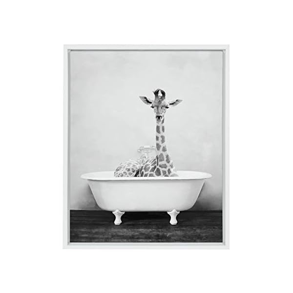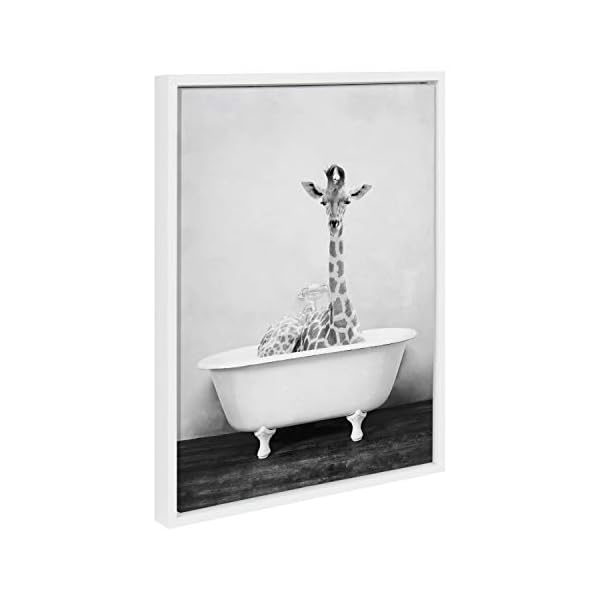 Scrub-a-dub-dub! This giraffe is ready for the tub! This whimsical, farmhouse-style bathroom art. Framed in the USA in Waunakee, Wisconsin, this floating canvas art will be a pleasure to look at every day in your living room, bedroom, nursery, or any room in the home. Printed on gallery-wrapped canvas and framed with a lightweight polystyrene frame, this wall art has two hangers already attached to the MDF back for easy wall display. The outer dimensions are 24 inches tall by 18 inches wide by 1.63 inches deep. Print Name: “Giraffe 2 in the Tub”
