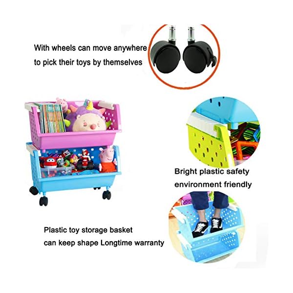 1. Stackable : Removable toy storage basket with wheels for playtime and easy clean up.