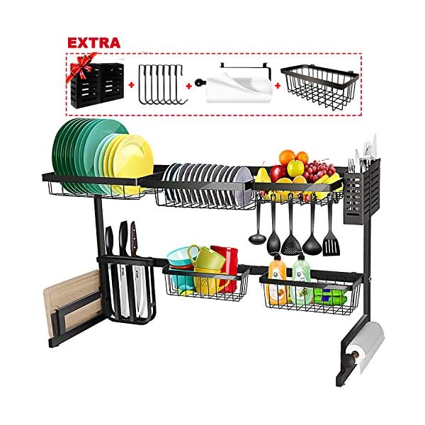 ?【UPGRADE ACCESSORIES – MEET ALL YOUR NEEDS】- Tsmine dish drainers for kitchen counter can store various sizes of utensils, According to customer needs,we added a paper towel holder, extra chopstick holder and basket,now the set includes: dish rack, bowl rack, knife holder, fruit & vegetable basket, chopping board & pot cover holder, 2 detergent holder, cutlery holder & 2 chopsticks cage ,tissue holder and 7 utility hooks.