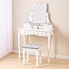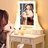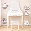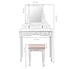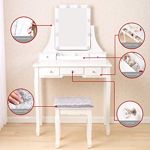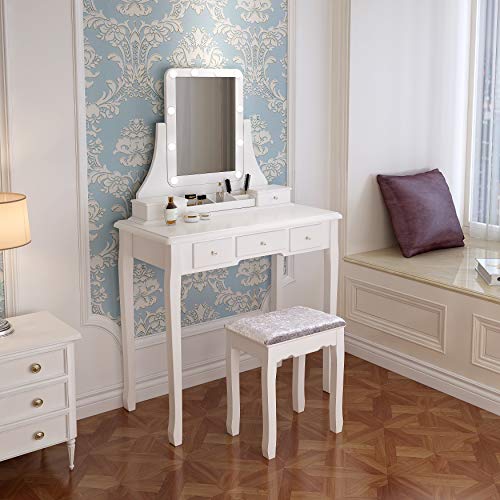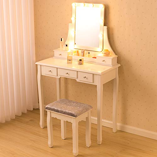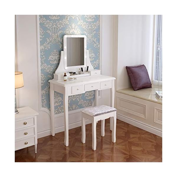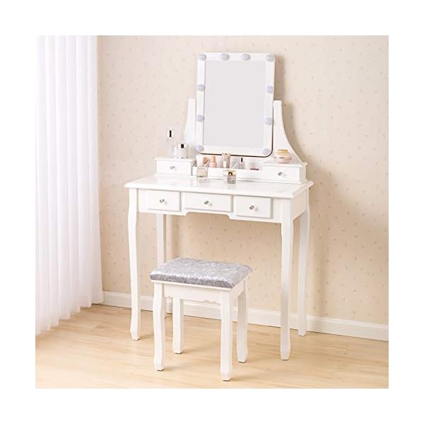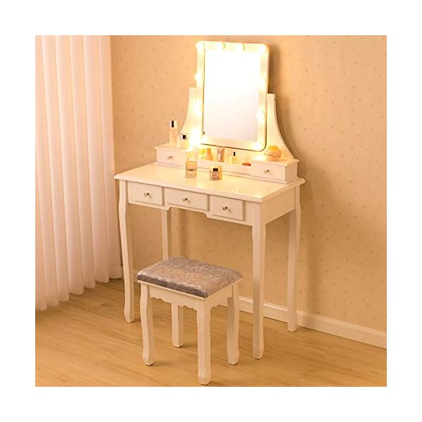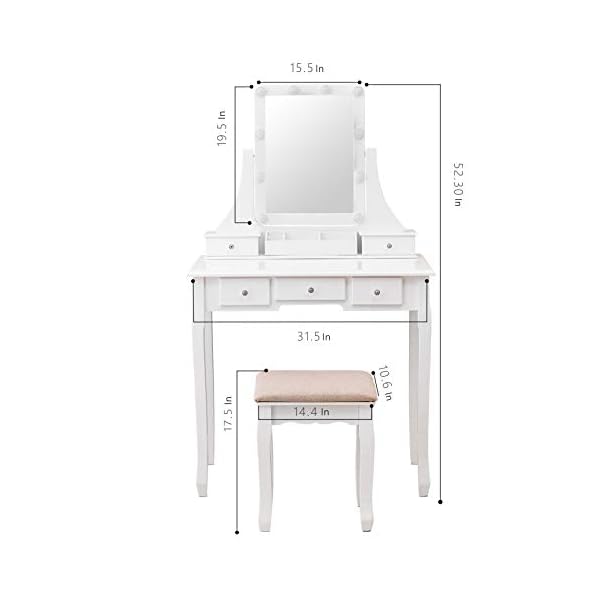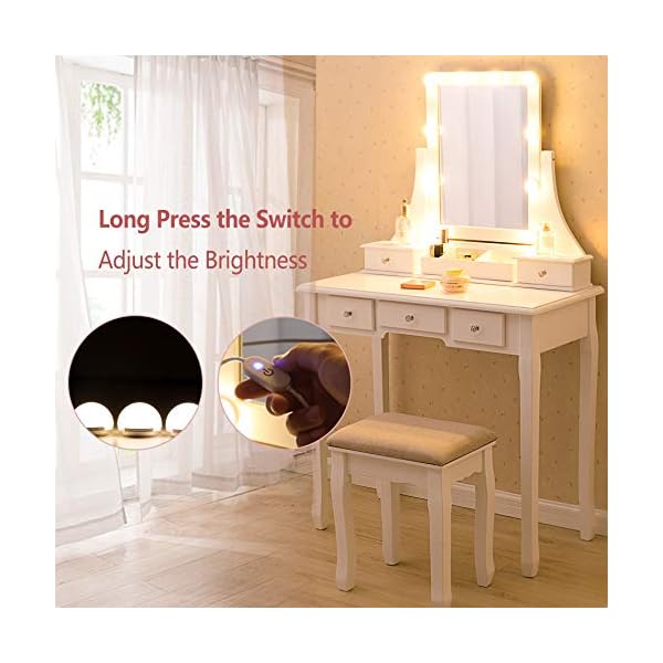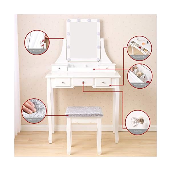 Ample Storage Space: This makeup table with mirror has 5 drawers, you can put your various cosmetics, jewelry, perfume, makeup brushes, etc. The partitions in the drawer can keep your makeup neat and orderly.