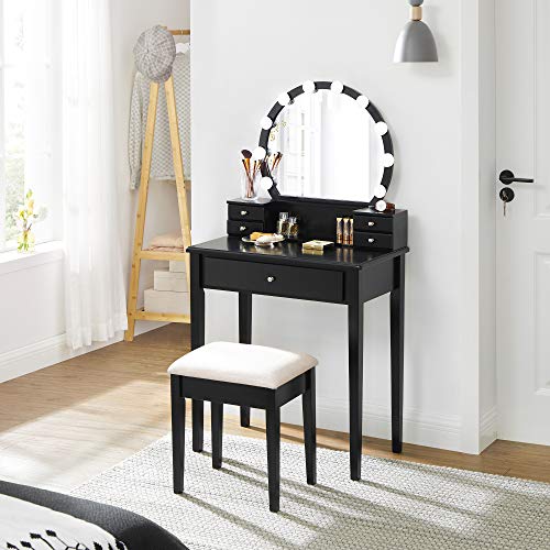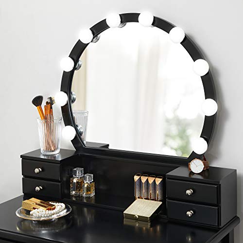 Let Your Beauty Shine: Say goodbye to makeup flaws that can’t be seen in a single dull sconce and admire your outfit in the large, round mirror of this dressing table with its 10 dimmable light bulbs—oh yes, you look really great!