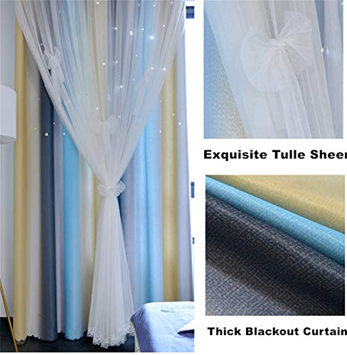 UNIQUE DESIGN: Curtains constructed with 2 layers, with Star Cut-Outs the inner layer and tulle lace outer layer. We use high-tech hollow technology cut edges and corners, leaving the star shape intact and clearer. When the sun shines in, stars will emit light, through the screen, forming a dream starry sky.